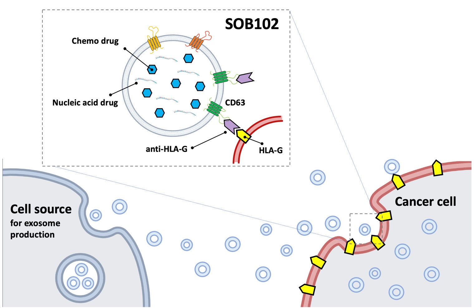 SOB102 是HLA-G靶向性外泌體核酸藥物,為SOB100技術平台下的第二個廣效型外泌體抗癌新藥,技術平台下的第二個外泌體抗癌新藥, 利用HLA-G靶向性外泌體遞送核酸藥物,用於治療難治的腦瘤如多型性膠質母細胞瘤(glioblastoma multiforme, GBM)及其他實體瘤。 SOB102已由動物實驗證實,可通過血腦屏障,抵達腦部組織, 對抗藥性腦瘤治療效果佳, 具有清除腦瘤的潛力。